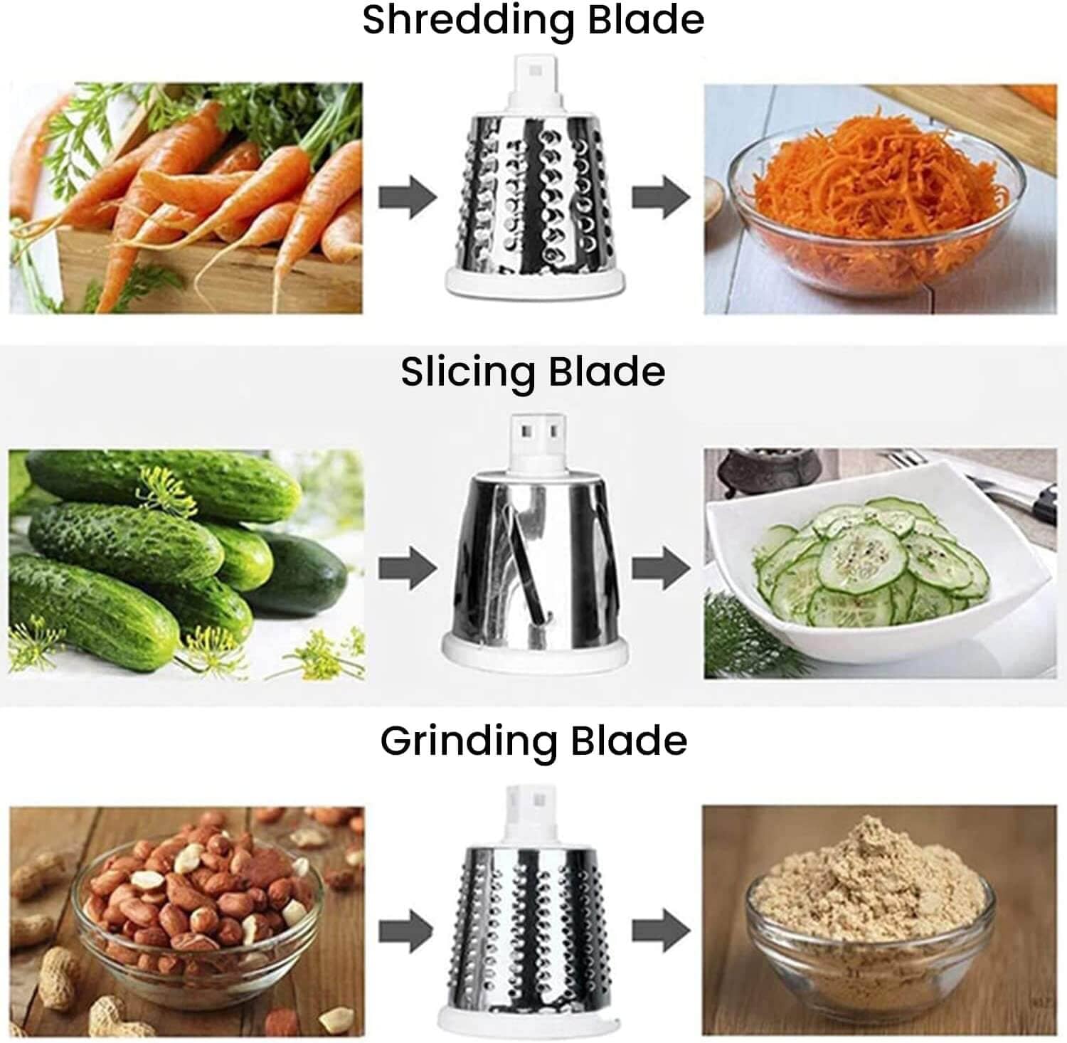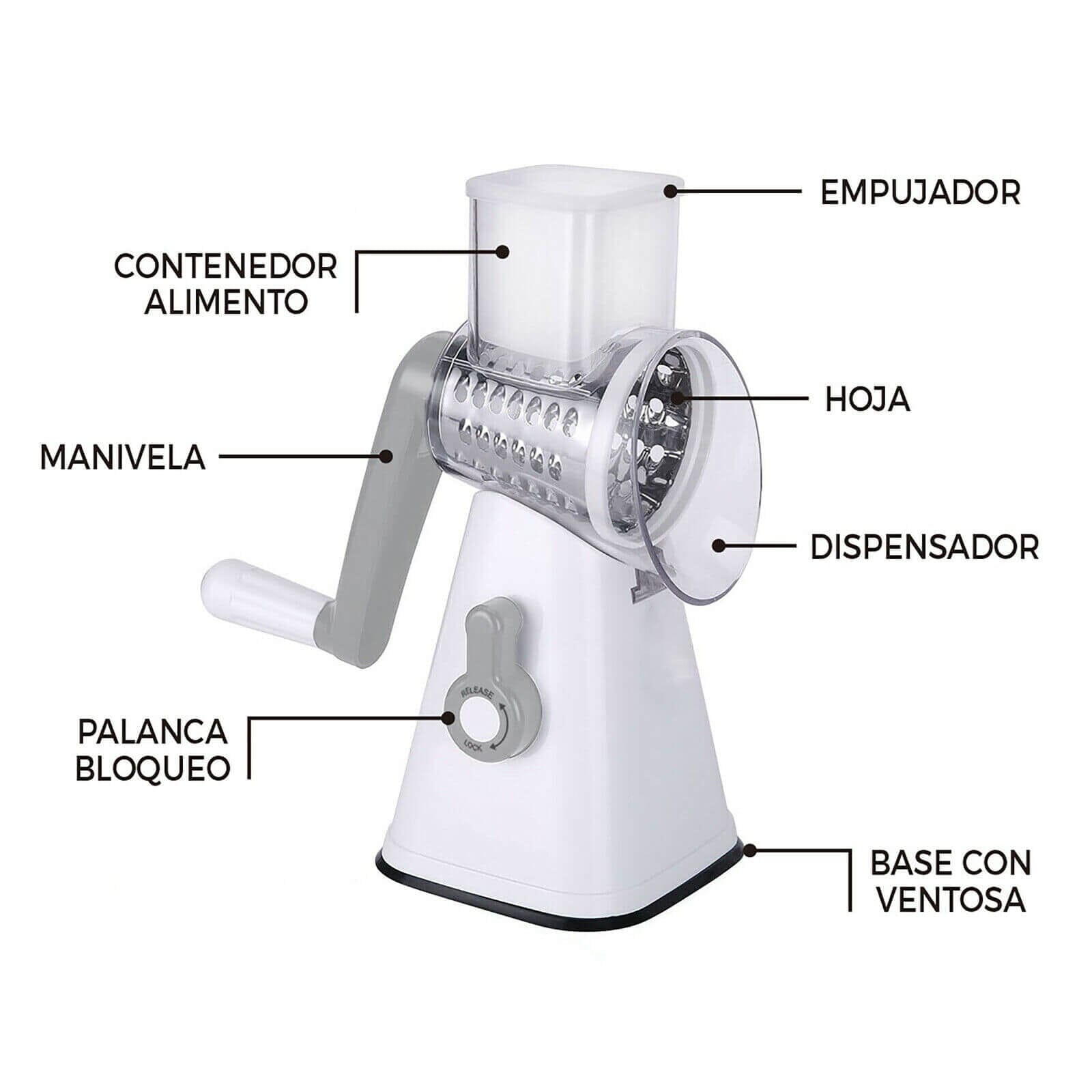 3 HOJAS INTERCAMBIABLES DE ACERO INOXIDABLE: que permiten rebanar, cortar y rallar los alimentos de forma rápida y uniforme.